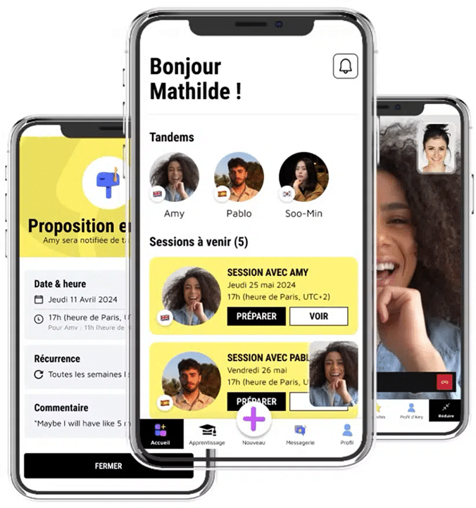 Nous avons développé une plateforme tout en un pour le projet (e)Tandem : une app mobile et un site web pour les étudiants, et un backoffice web pour les enseignants. La plateforme intègre toutes les étapes du parcours : inscription, recherche de binôme, matching, échange par chat ou visio, autoévaluation…